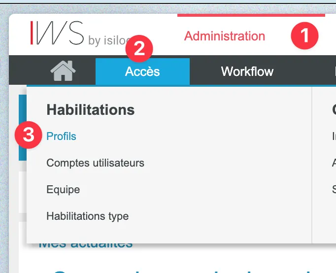 Dans IWS, se rendre dans la partie “Administration” / “Accès” / “Profils”.