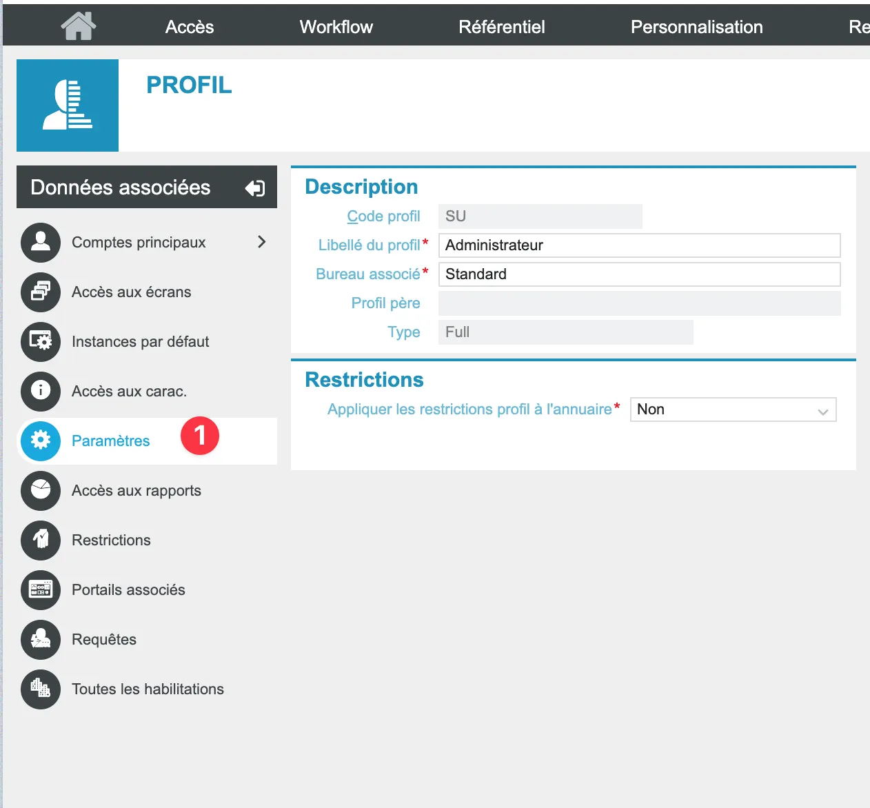 Choisir le profil administrateur (ou autre si profil spécifique de créer) et ouvrir la rubrique “Paramètres” de ce profil