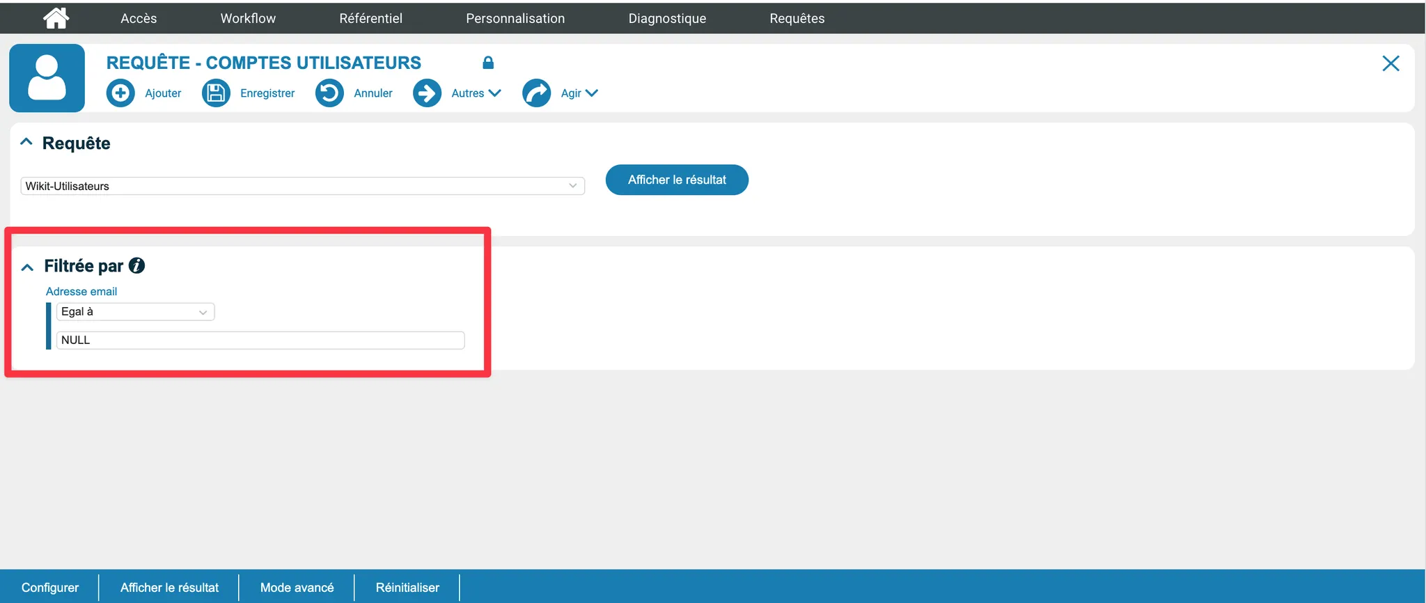Puis ajouter un filtre sur “Adresse email” Egal à “NULL”